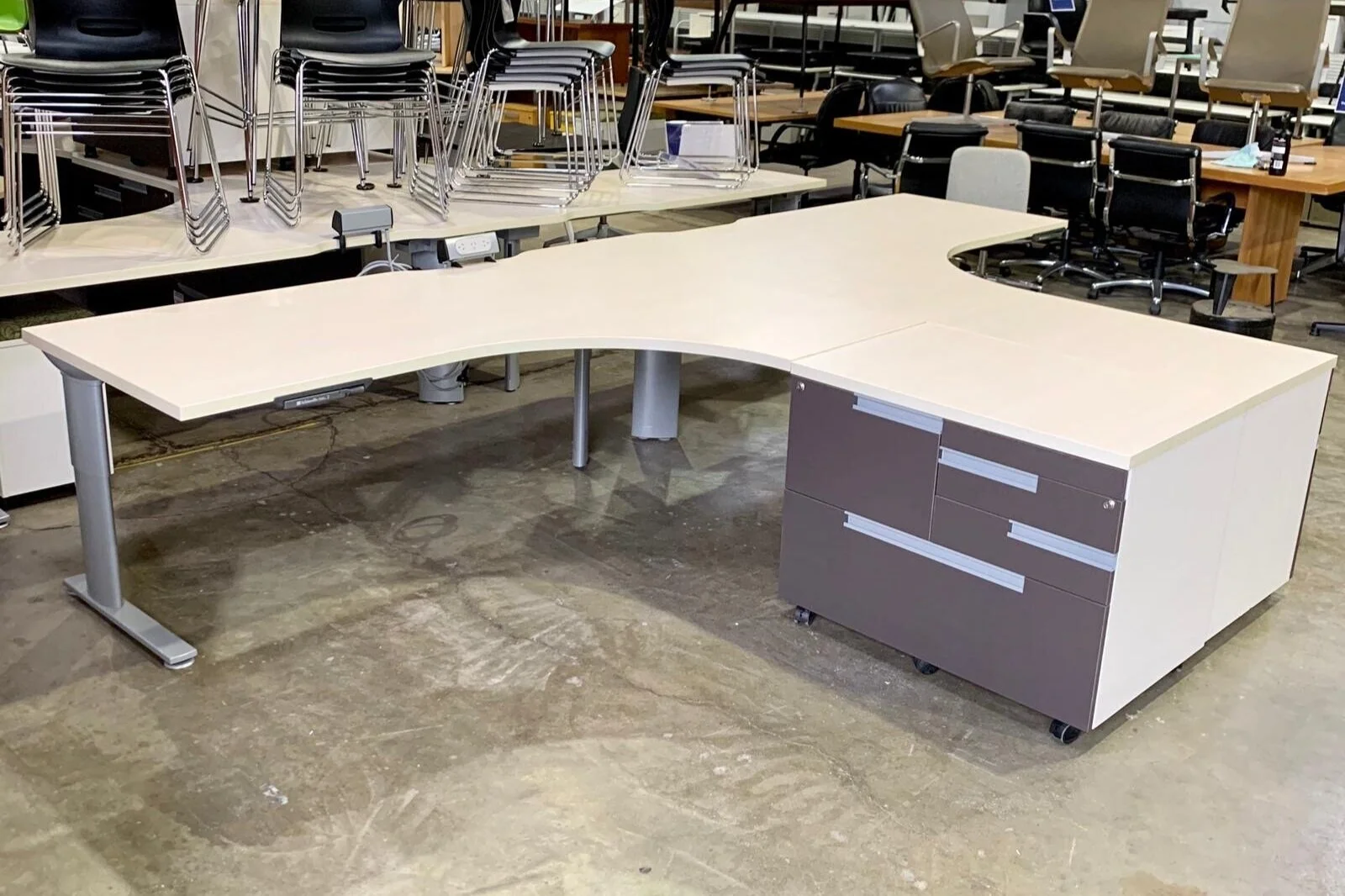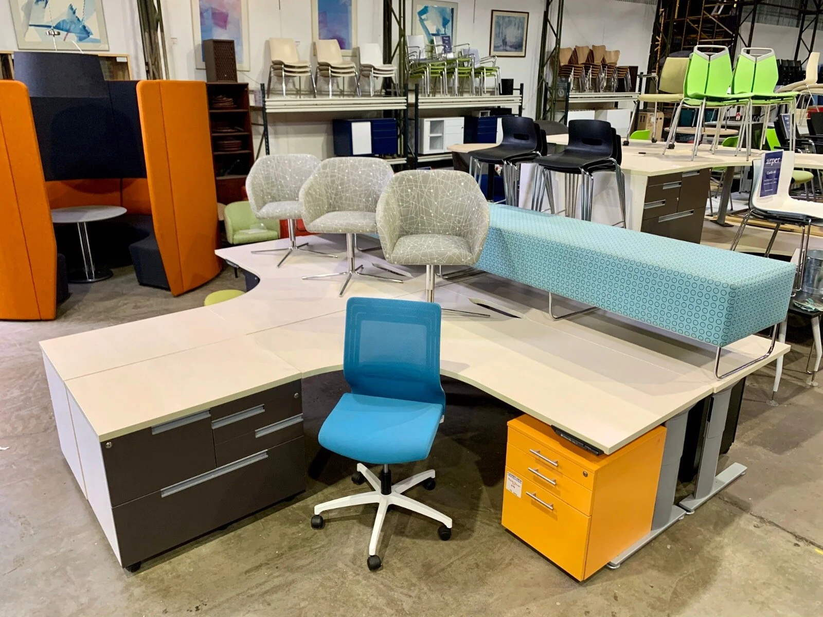 The Schiavello height adjustable workstation (wind up mechanic) is a prime example of the multi-functional desk and table solutions that Schiavello are famous for – and we have these available now. The shape of this particular desk allows it to fit perfectly into a corner as a stand-alone desk, or it can be linked up with multiple desks to create a workstation layout to suit your requirements. The wrap-around desk style is highly effective from an ergonomic perspective as everything on your desk is easily accessible, minimising any possible strain. And with the desktop manufactured from poplar laminate, its colour makes it easily adaptable to any environment.