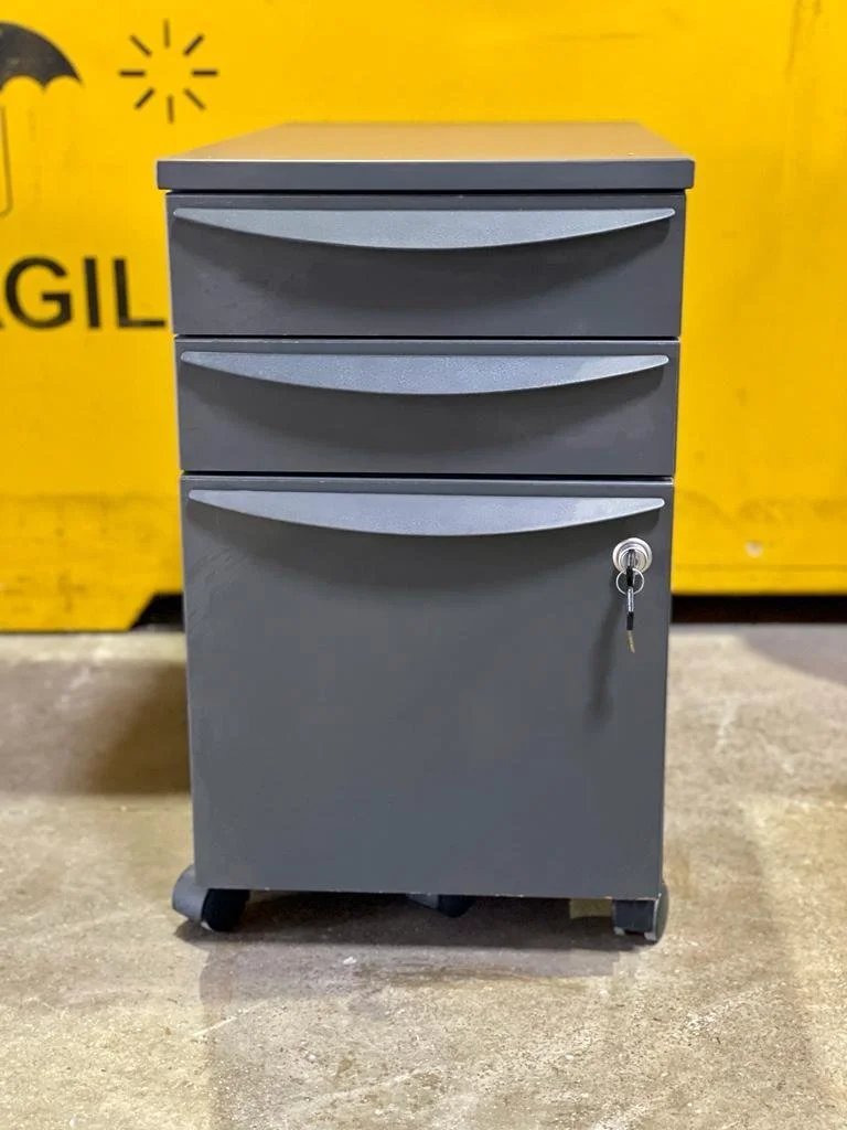 1. Schiavello 2-drawer pedestal: manufactured in high quality grey metal, on 4 castors, this model has one standard drawer and a pull-out filing drawer. It is lockable.