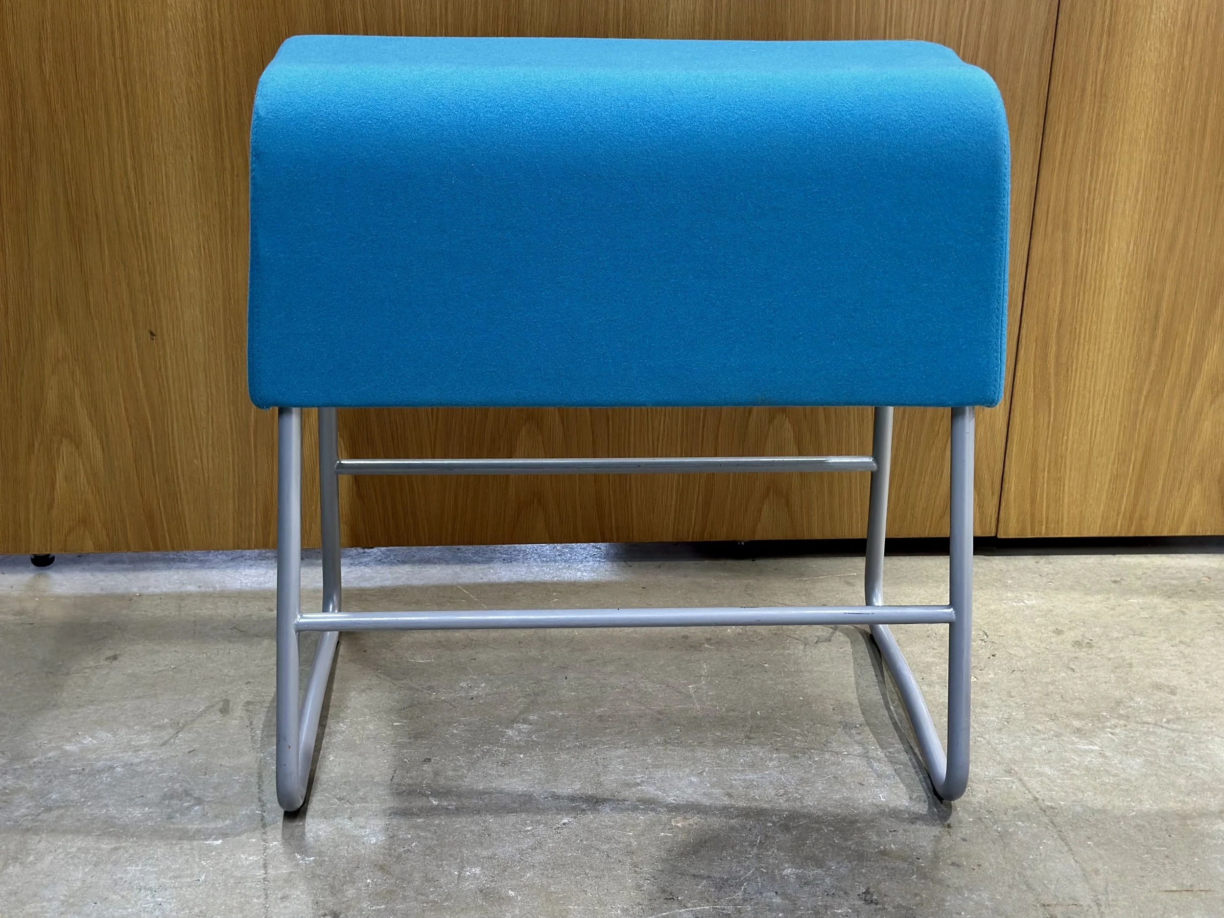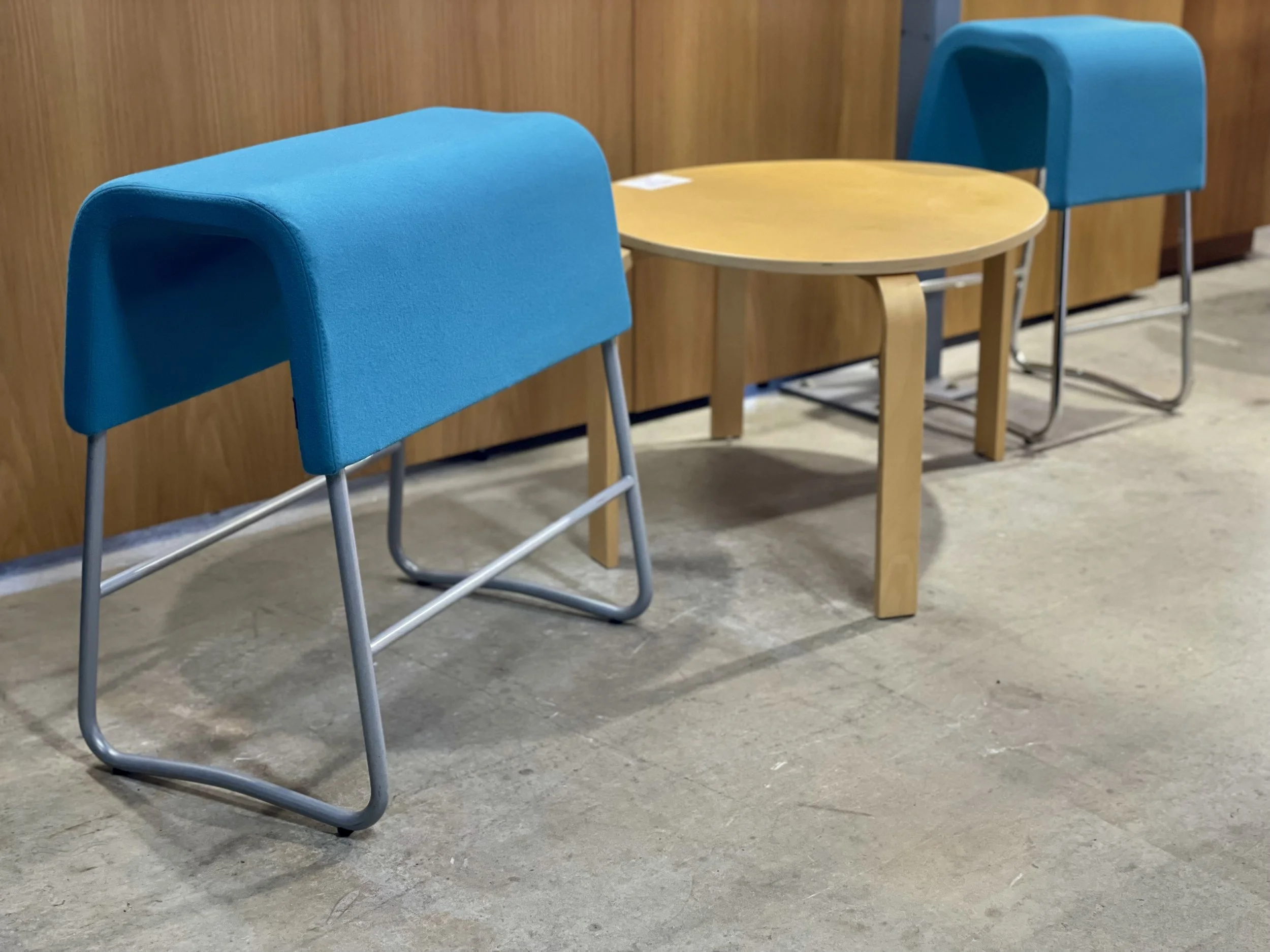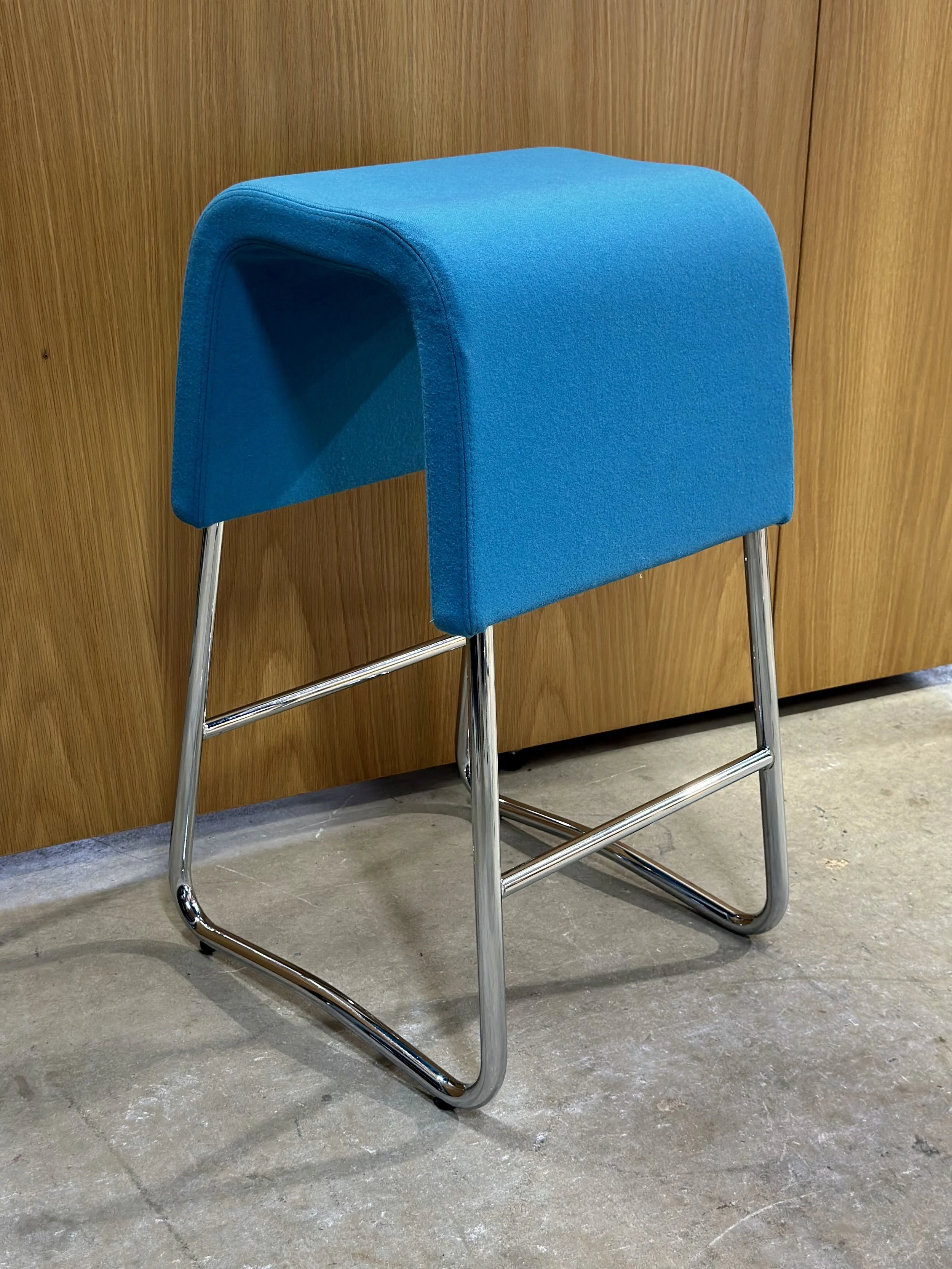 At 630mm high, they suit lower kitchen benches and shared tables. The blue upholstery introduces colour in a controlled way, pairing easily with timber, pale finishes, and neutral interiors typical of Scandinavian-style spaces.