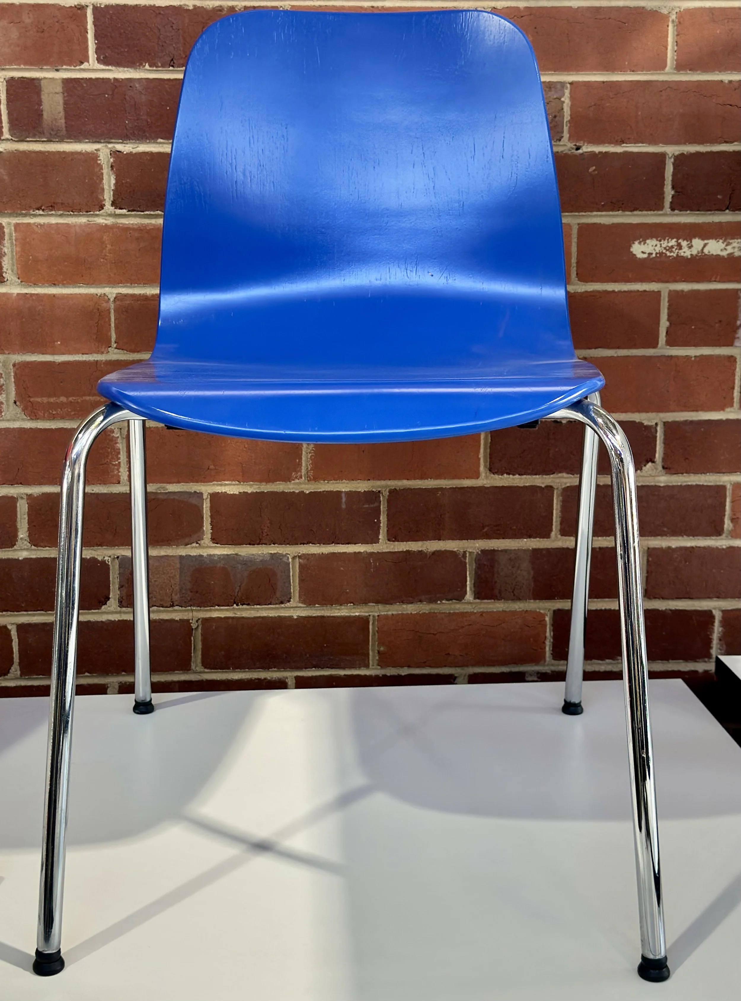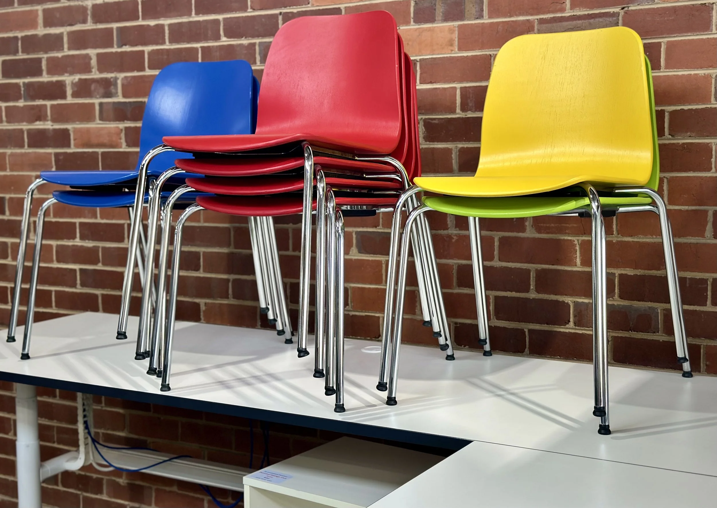 Stacking protectors sit under each chair and stop the metal frame scratching the painted surface. That small detail helps the finish stay looking good over time, especially where chairs are moved often.