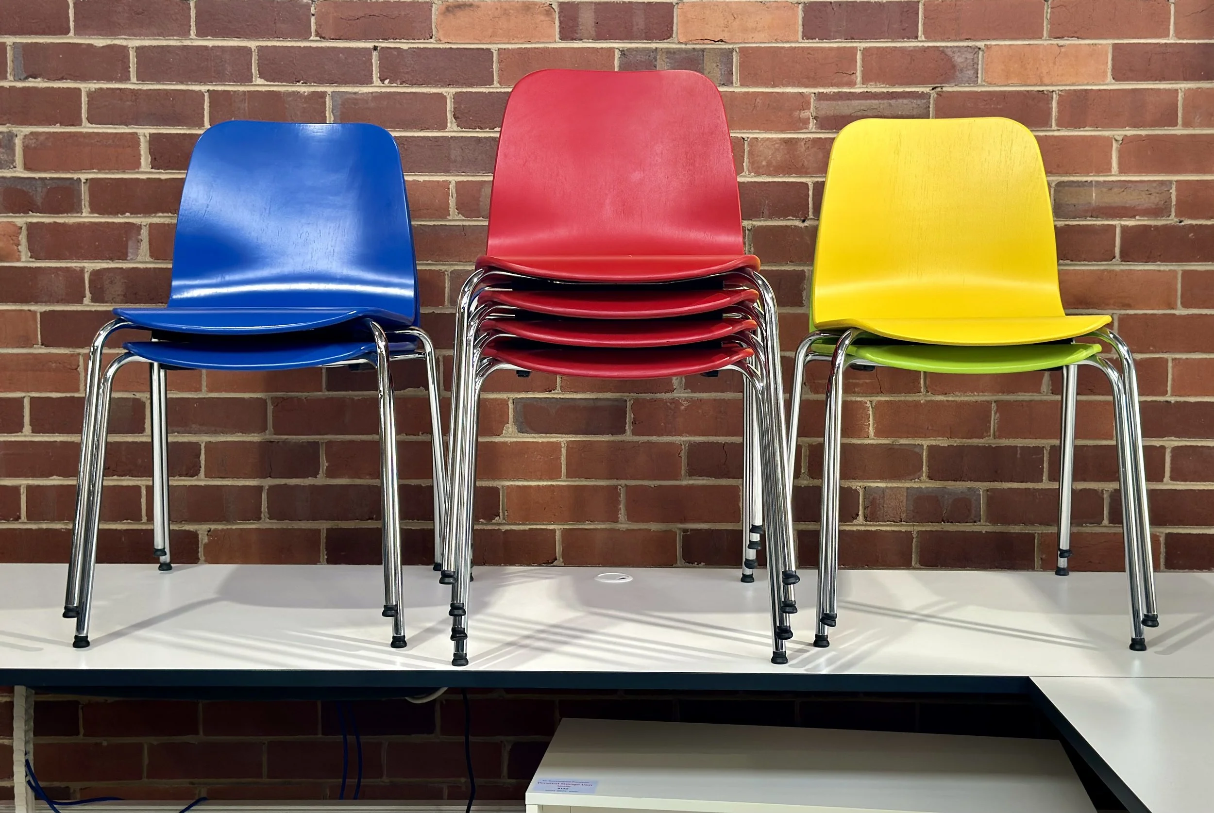 The mix of red, blue, and yellow drives the appeal. It brings energy into neutral spaces and breaks up rows of white desks or grey interiors. Around a table, mixed colours feel relaxed and informal, while a single colour keeps the space clean and uniform when that’s the goal.