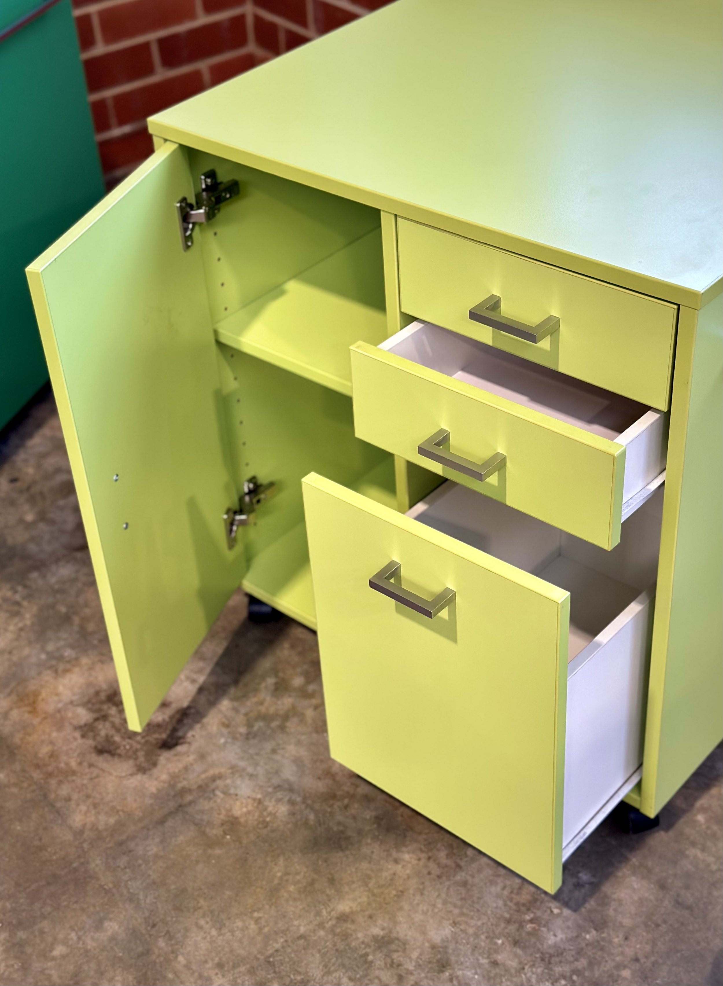 The layout combines three drawers with a full-height cupboard. This allows everyday items, stationery, and files to be organised separately from bulk storage such as folders, bags, or equipment. It’s a practical setup for staff who need both filing and enclosed personal storage in one compact unit.